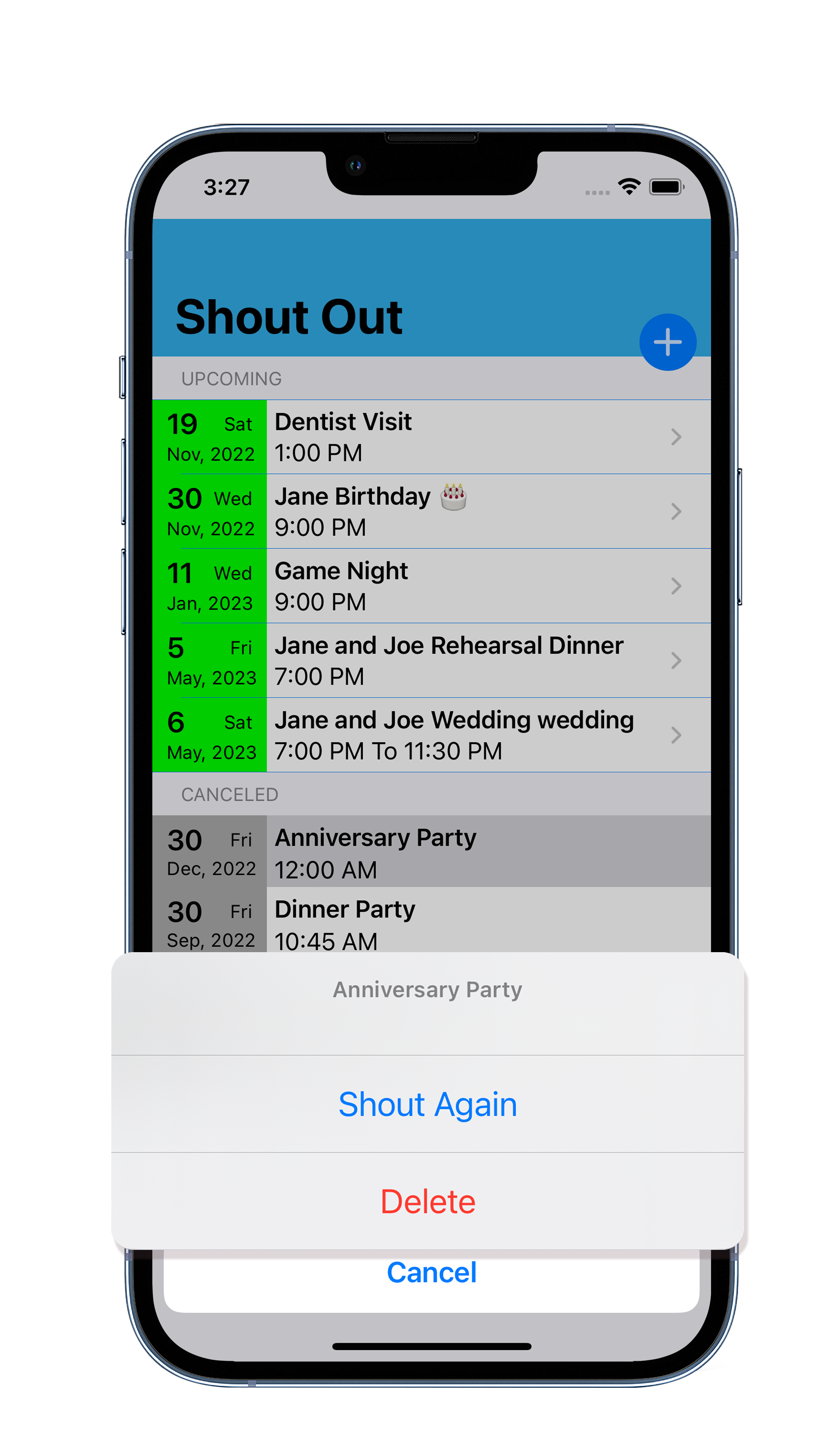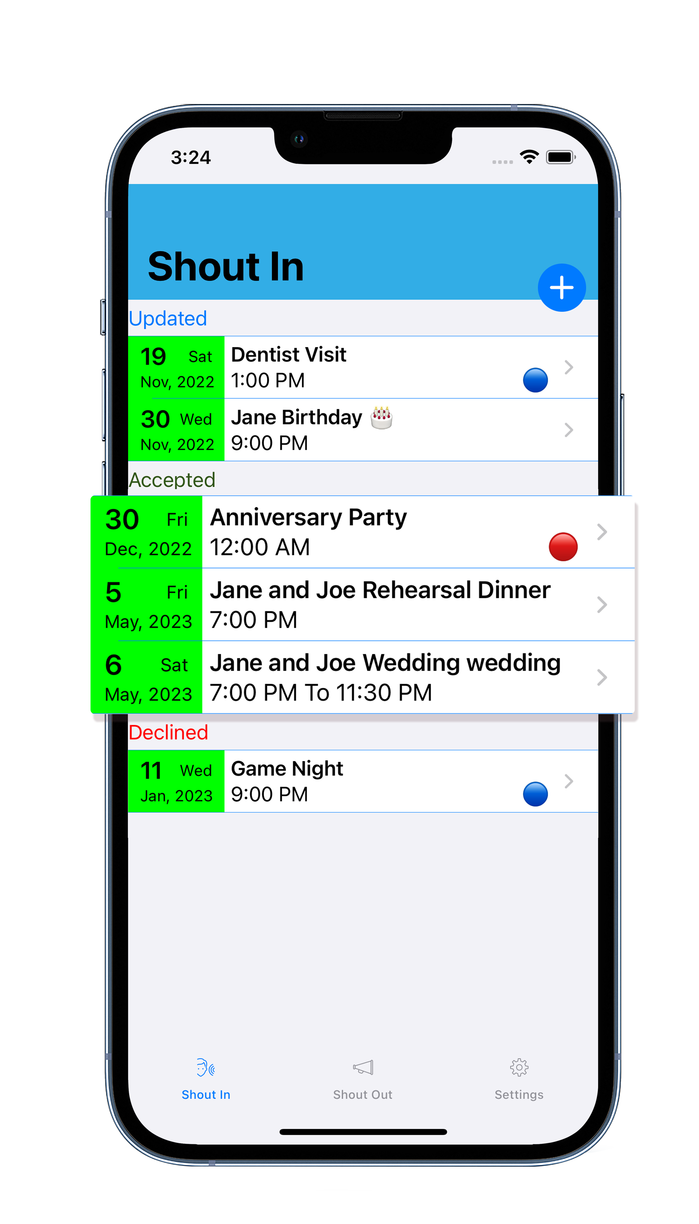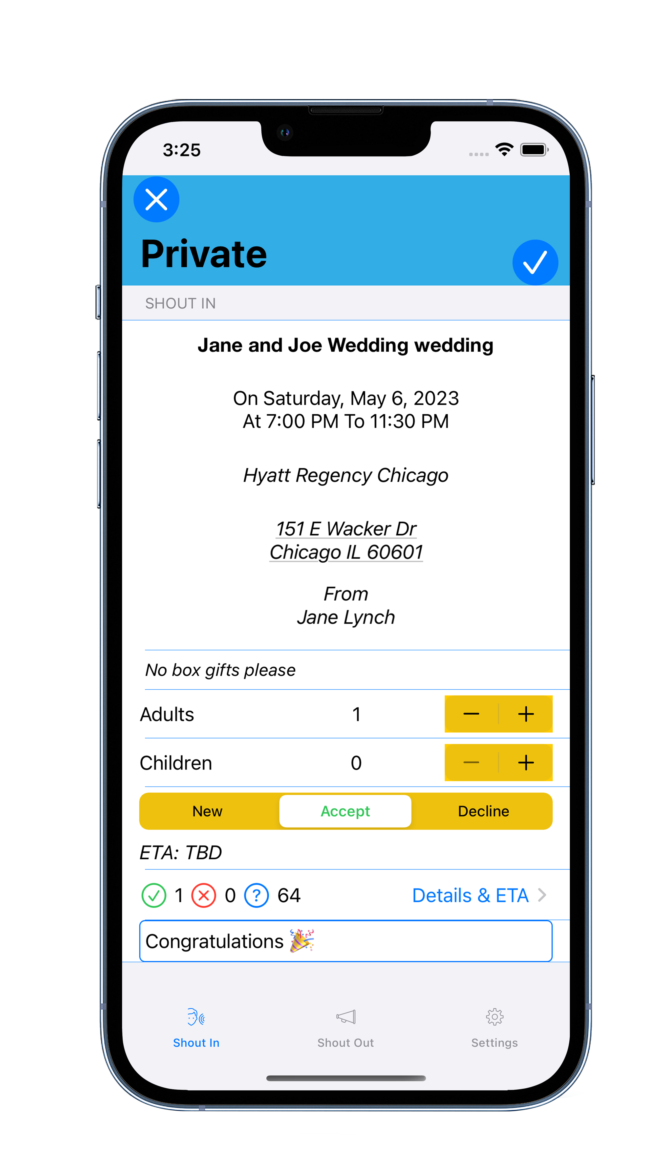 Create an activity (Shout) by giving it a name, date, place, and more important details. Then send the invitation to anyone on your contact list and use the app as an RSVP tracker
